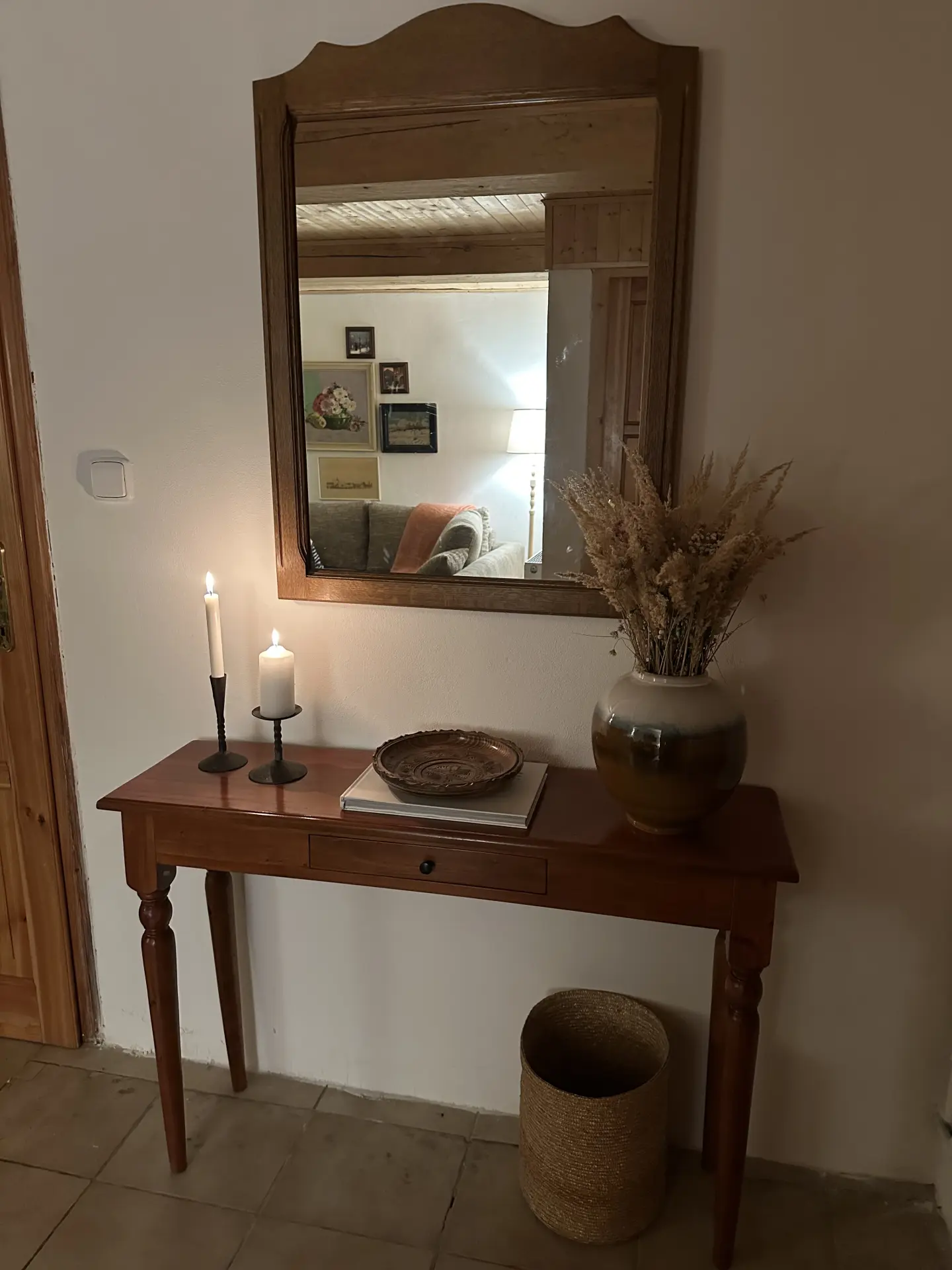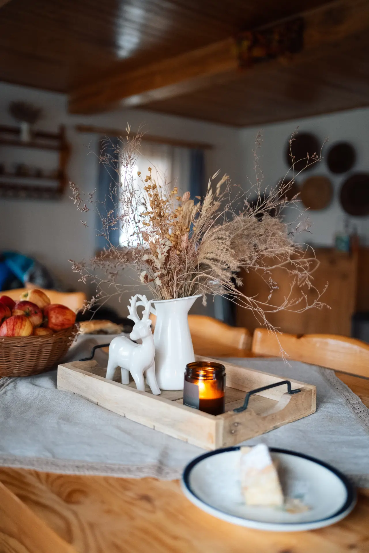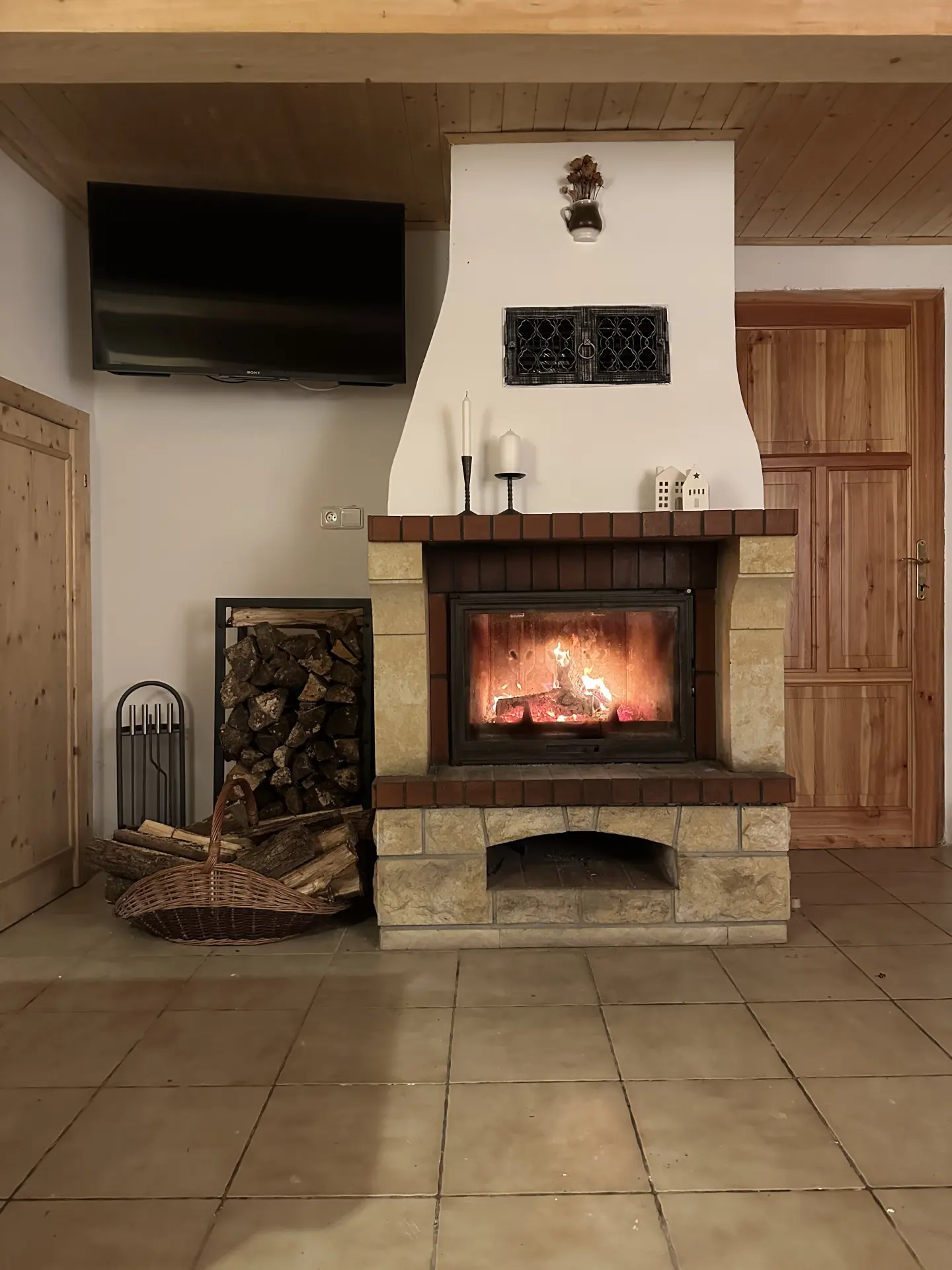 Společenský prostor s krbem, pohodlným gaučem, TV a deskovými hrami.