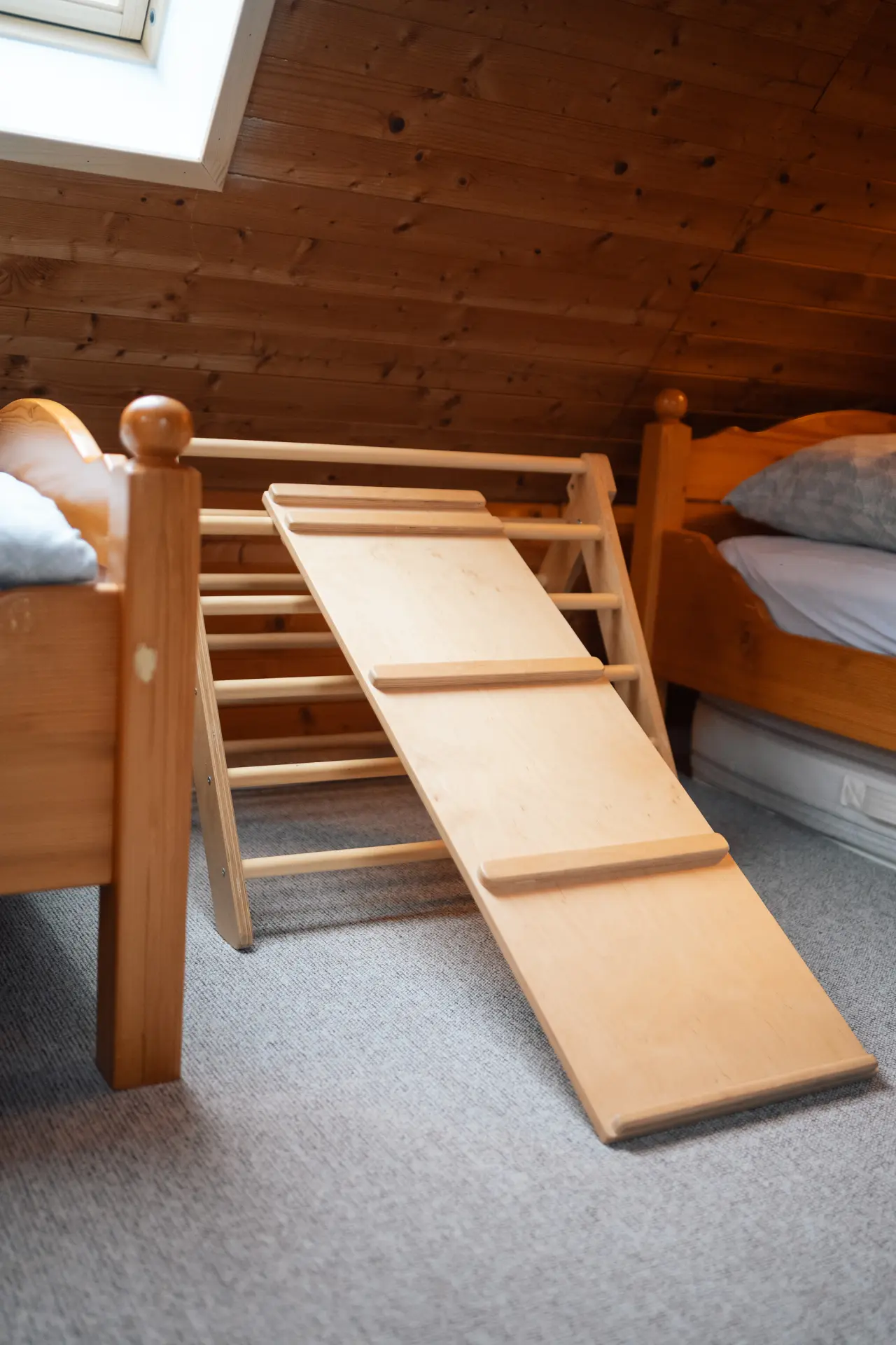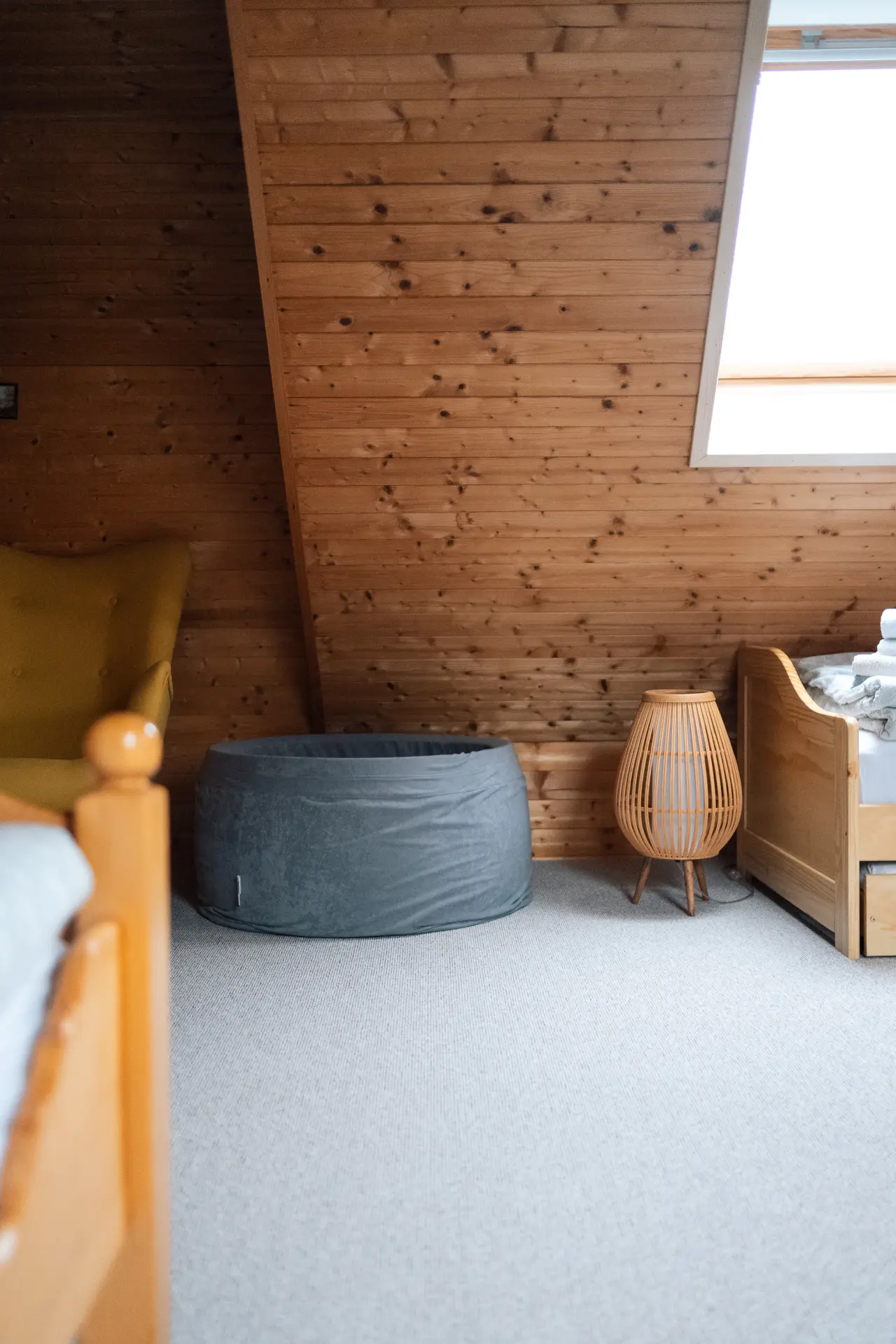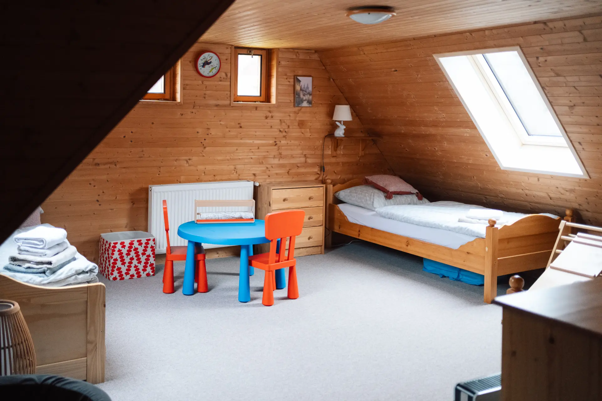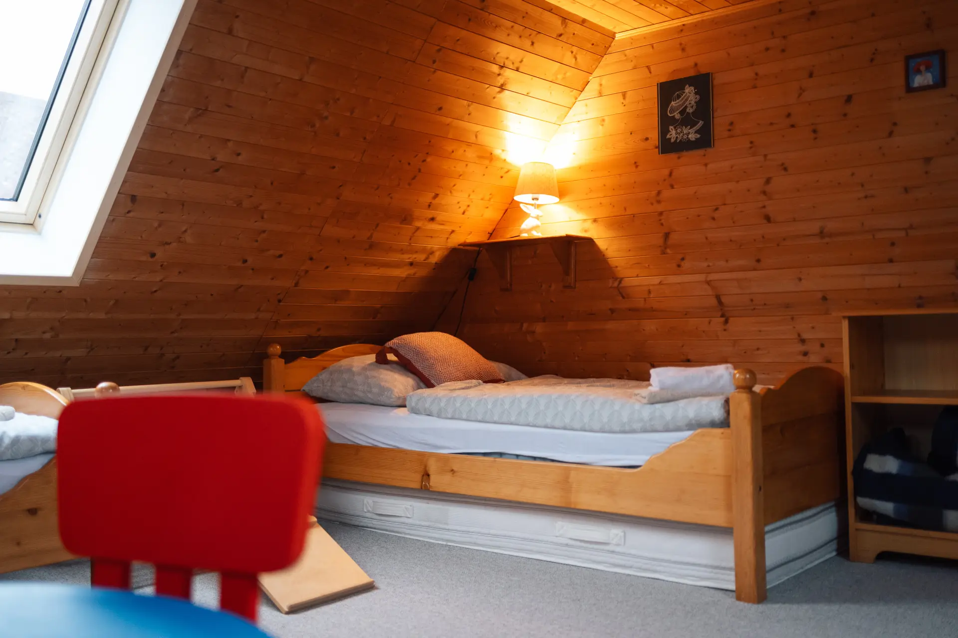 Pokoj se třemi jednolůžky a přistýlkou, součástí je také herna pro děti.