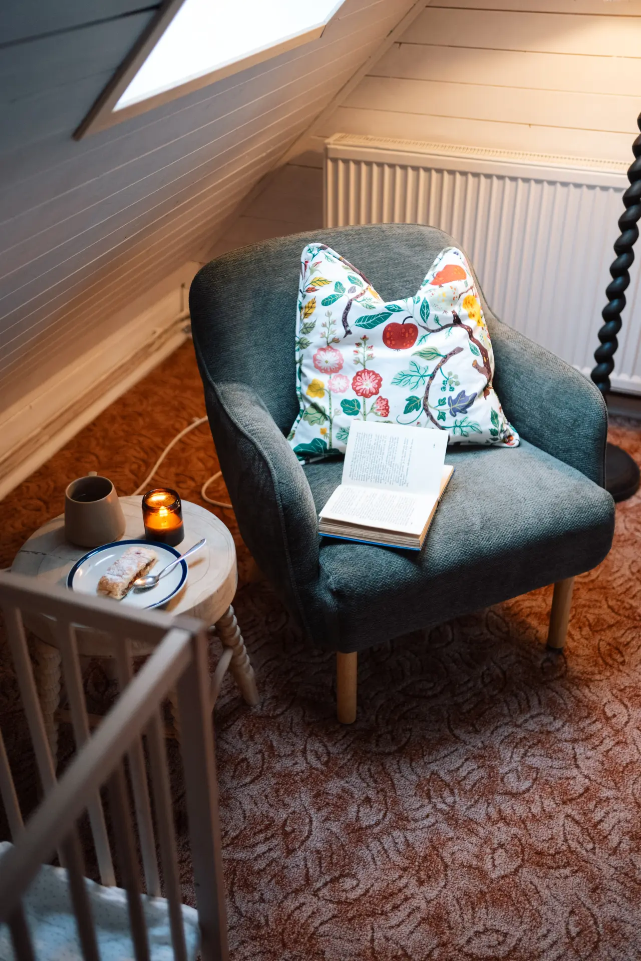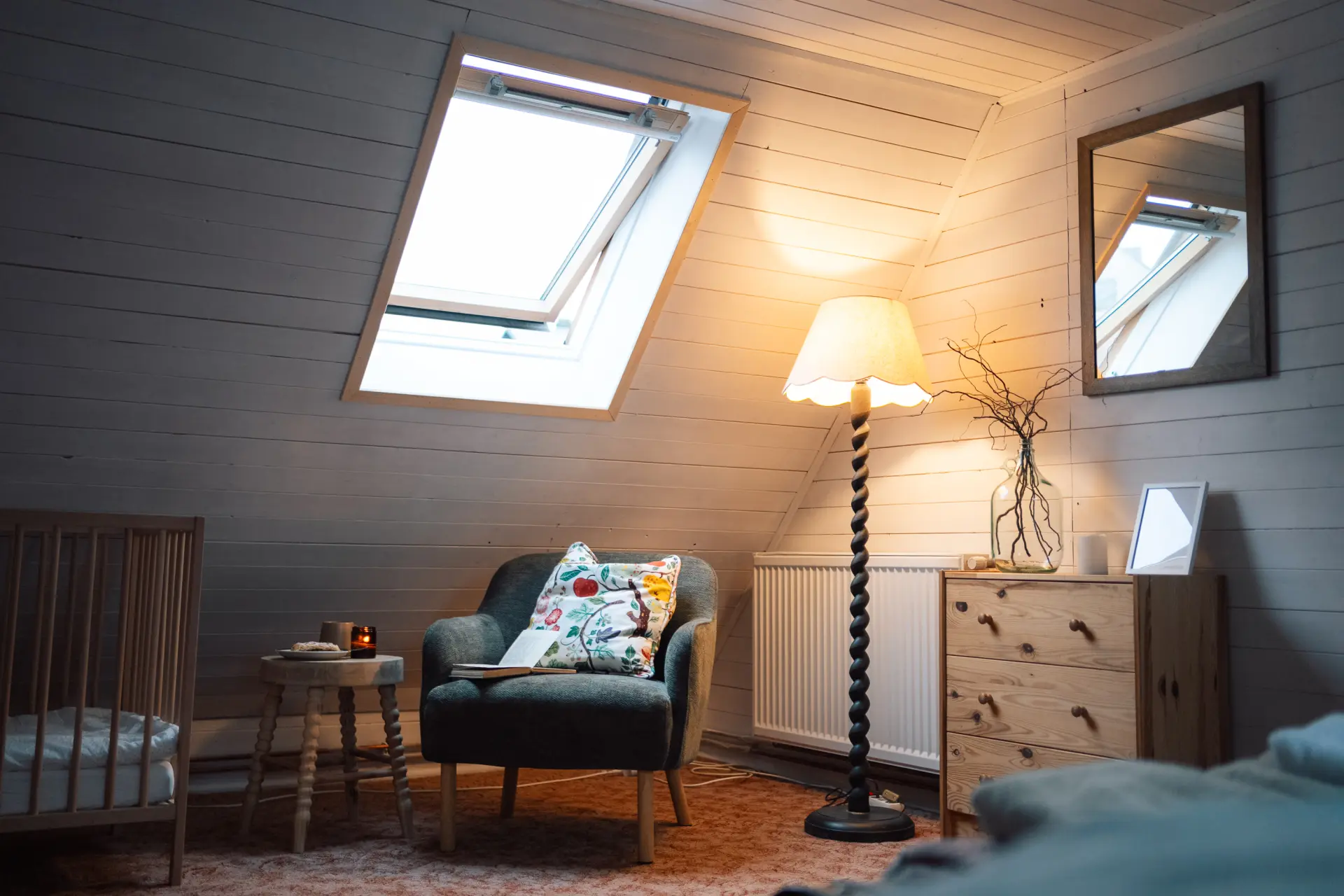 Rodinný pokoj s manželskou postelí a dětskou postýlkou.